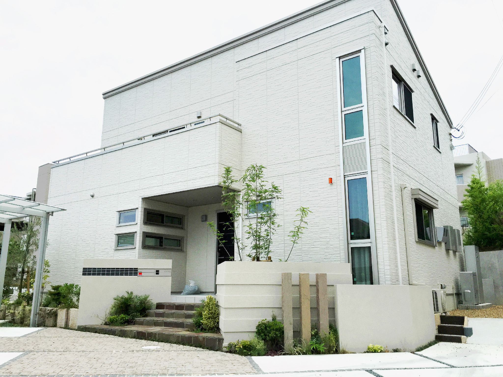 シンプルで素敵なお住まいを、より引き立てるようなエクステリアをイメージし、計画させて頂きました。エントランスアプローチは、扇型にすることで、広がりを感じることができます。お出かけ時にちょっとした癒やしを感じて貰えるよう、階段の両側には植物を配しました。