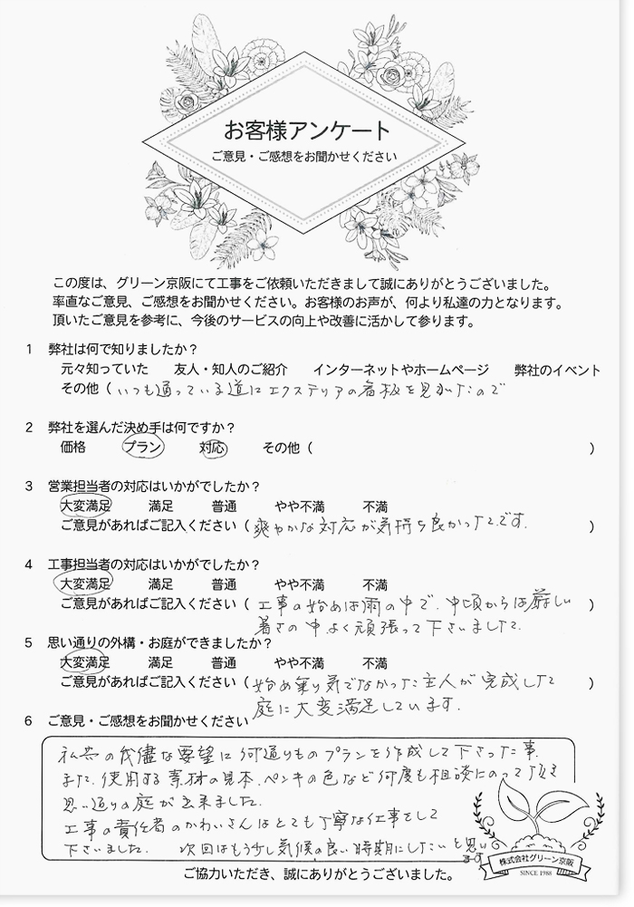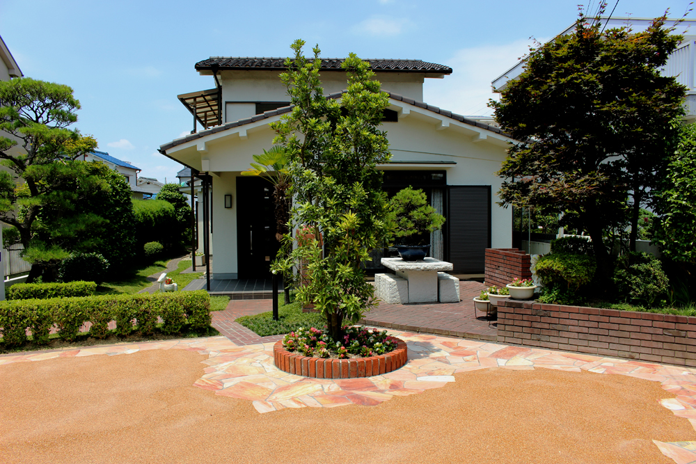 門扉、ポストを新しくリニューアルし、壁を補修した上に吹付塗装を施しました。防犯カメラも新設しましたので、安心ですね。明るく整った玄関廻りは気持ちがいいです。 門扉を開けると、玄関に至るまでのアプローチはレンガ敷き。期待感が高まります。 アプローチを抜けると、シンボルツリーのある空間が広がります。 以前は芝生でしたが、管理が大変だということで石貼りを御提案しました。ピンクの乱形石をランダムに動きをつけて貼ることで奥行きと広がり感を演出しています。シンボルツリーの足元は奥様の植えられたお花で華やかに。花壇は、レンガでサークル状にし、目を引くポイントにしました。
