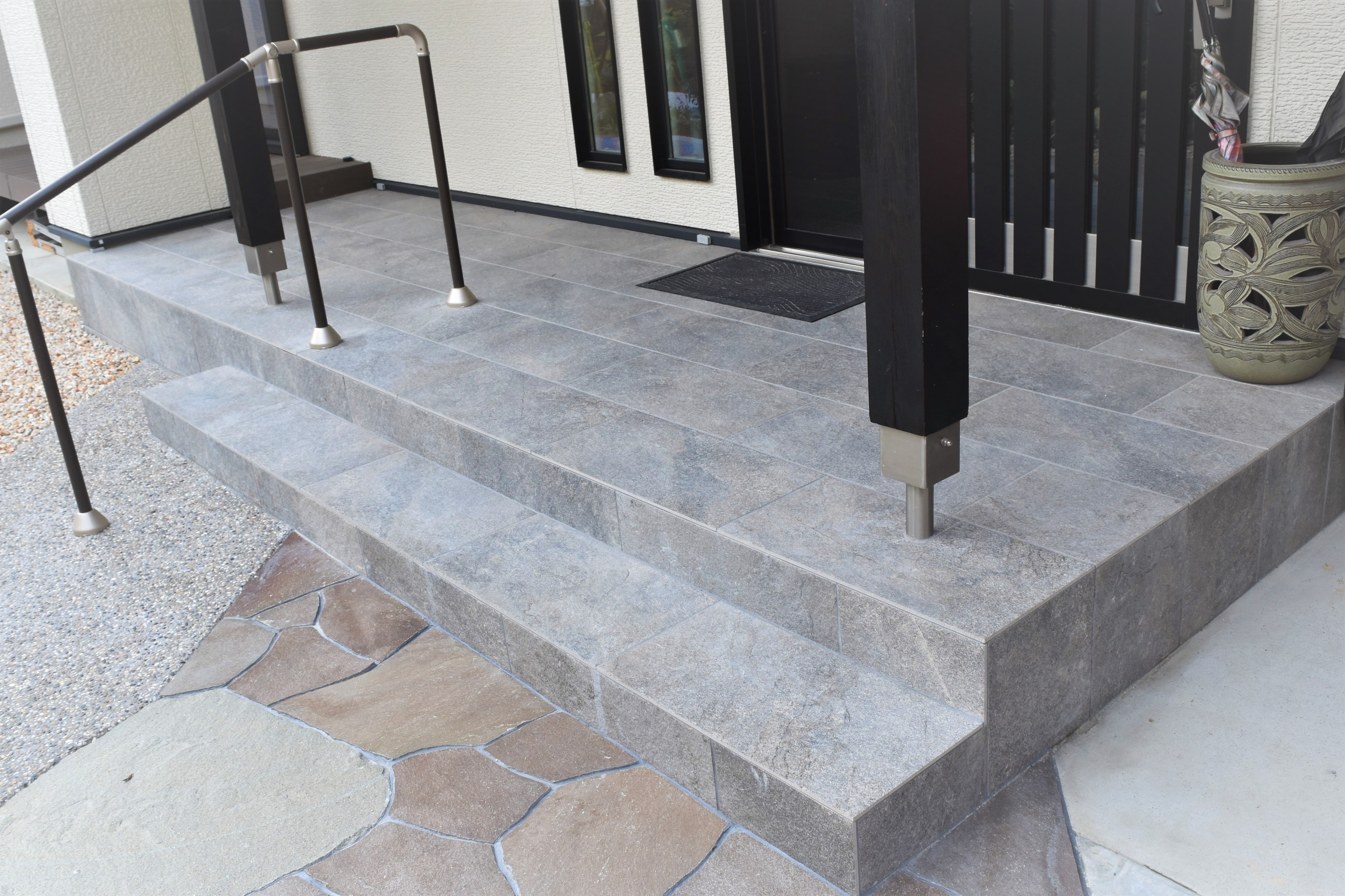 門柱周囲のコンクリートを撤去して、植栽スペース、さらには石材をアプローチにすることで迫力を出すようにいたしました。