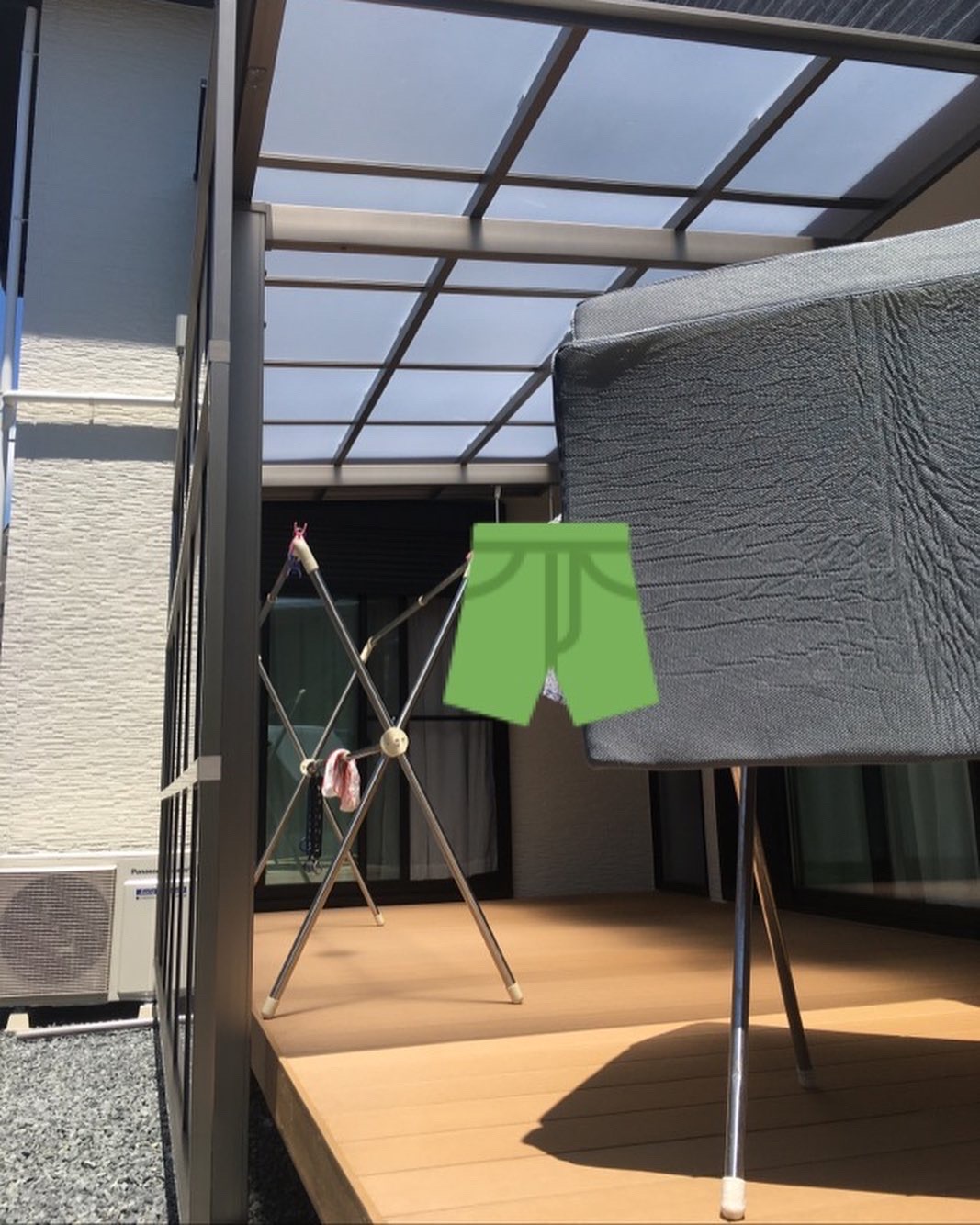 雨風はもちろん、夏の暑い日差しもお洗濯物の退色もいくらか軽減できる洗濯物干しに最適なスペースとなりました。