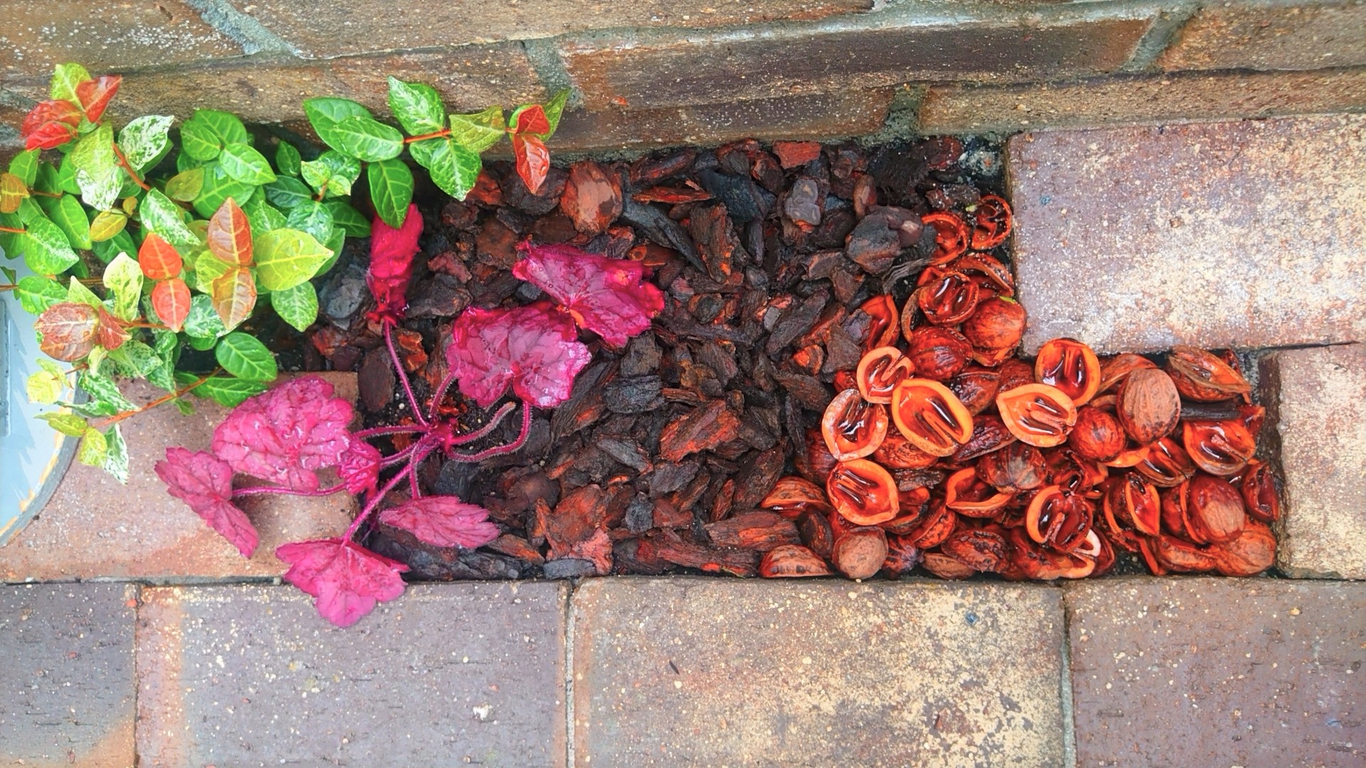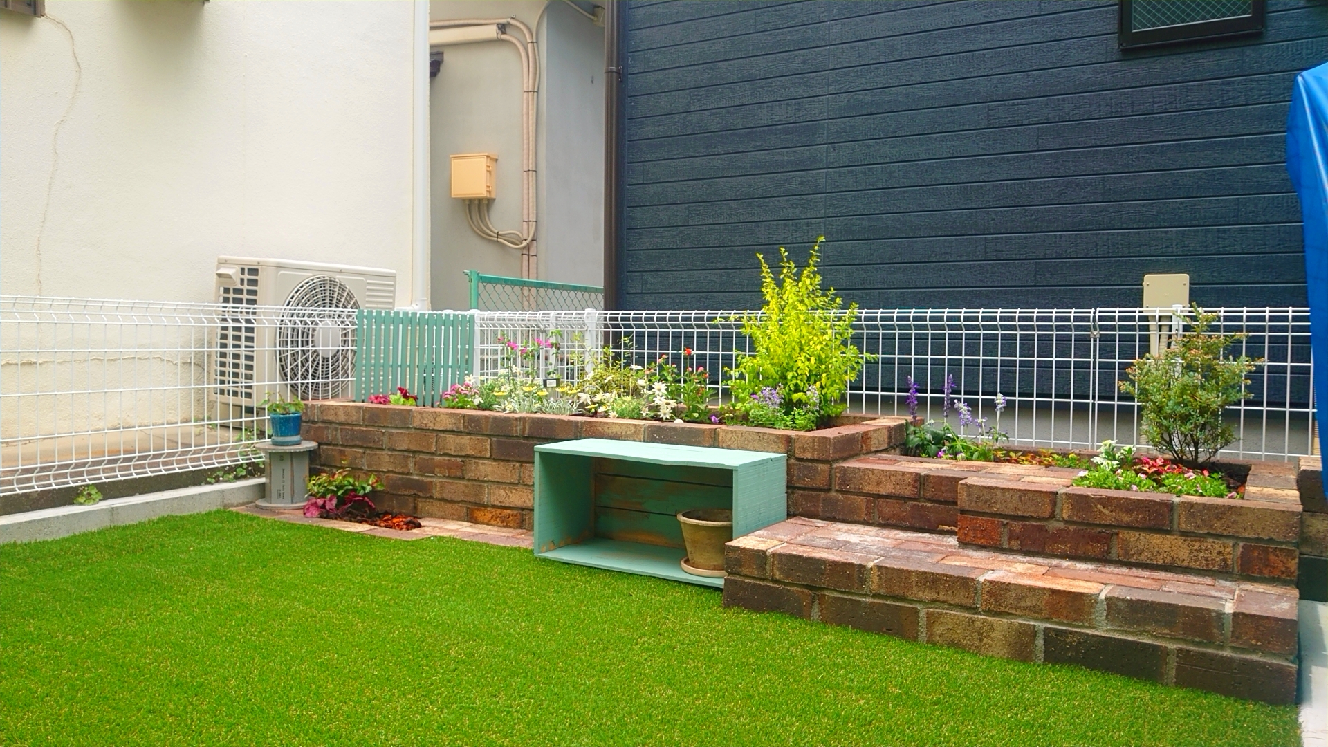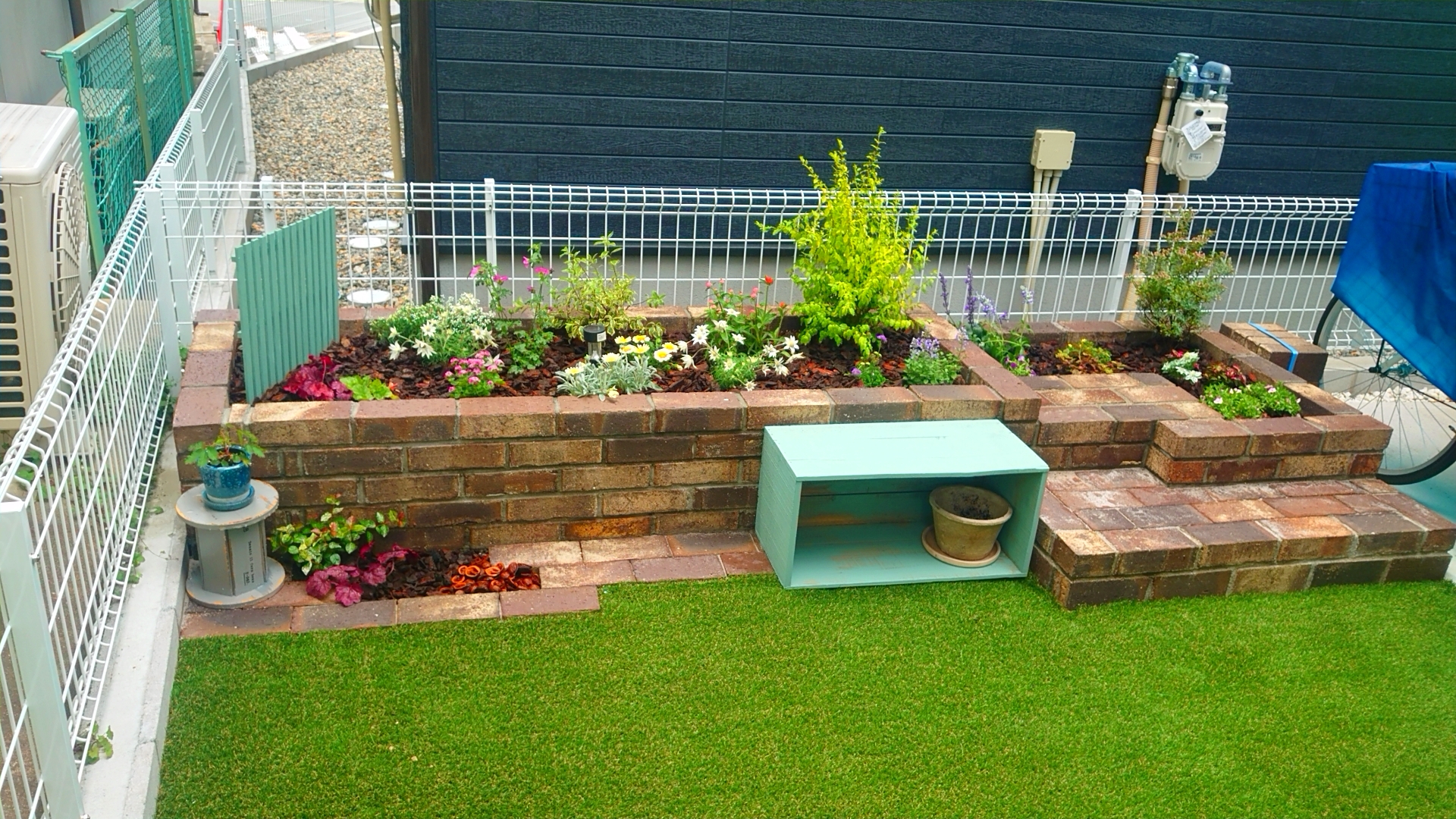 人工芝との境界もレンガを敷き、ここにも小さな植栽スペースを設けました。