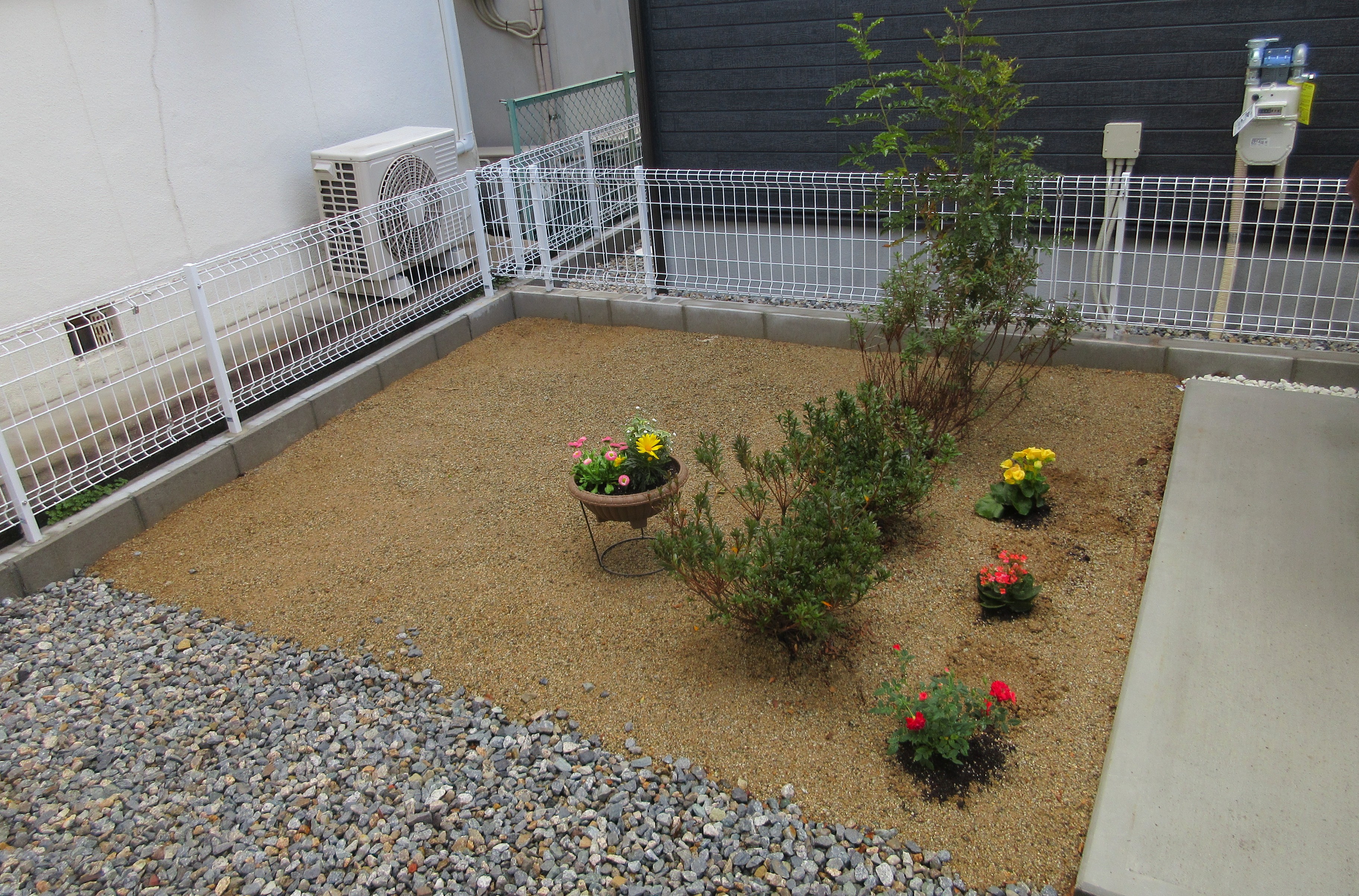 既存の砂利と植栽は撤去し、人工芝の敷設と花壇の新設を行いました。