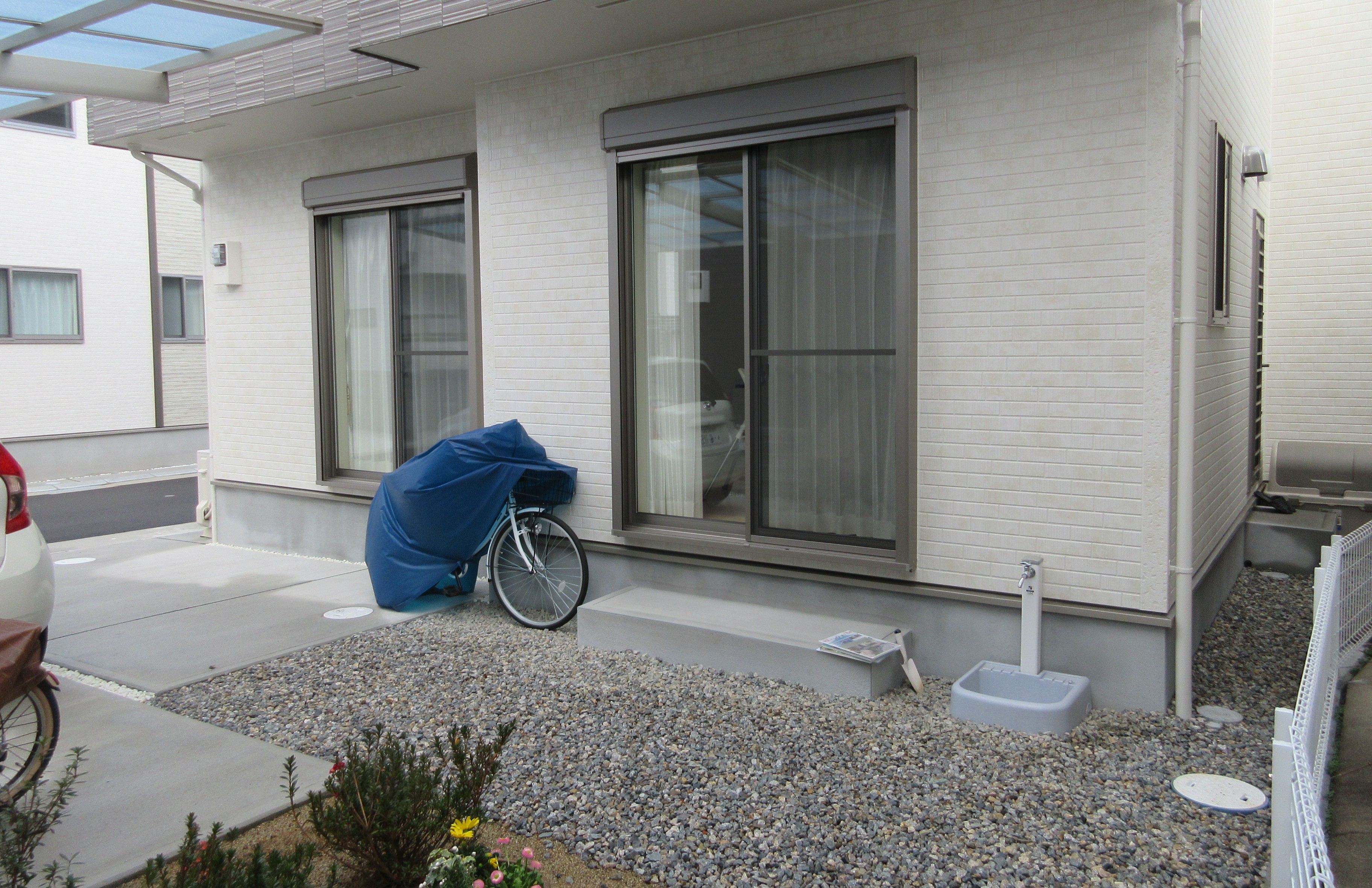 既存の掃き出し窓ステップもレンガで囲ってしまうことで、統一感を演出。